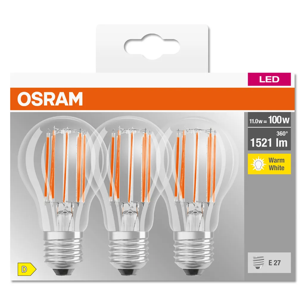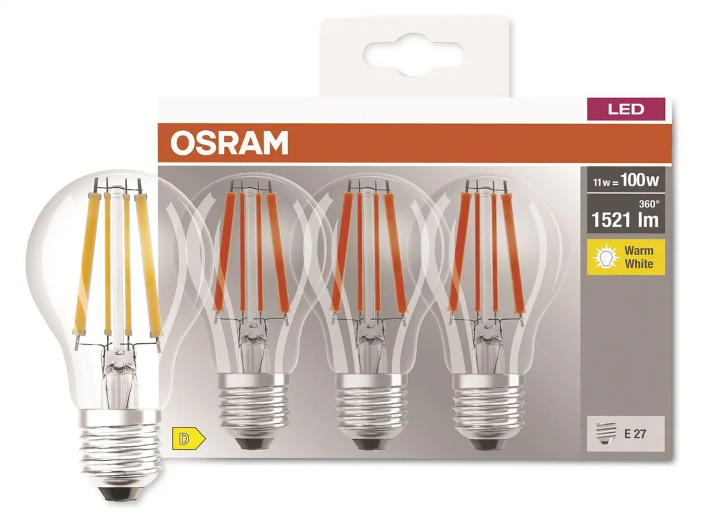 Mit den LED BASE Retrofit Filament Sparpacks der Marke Osram erwerben Sie die qualitativ hochwertige Basis-Version. Die Schaltfestigkeit beträgt 100.000 Schaltzyklen. Sie zeichnen sich besonders durch den, im Vergleich zu normalen LED-Lampen, höheren Wirkungsgrad, breiteren Ausstrahlungswinkel und noch geringeren Stromverbrauch aus. Durch die vertikale Anordnung der Leuchtfäden wird das Licht homogen in alle Richtungen verteilt und die Optik erinnert stark an frühere Glühlampen.