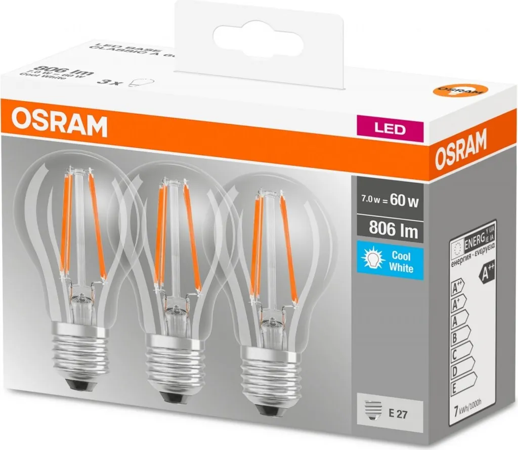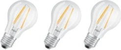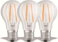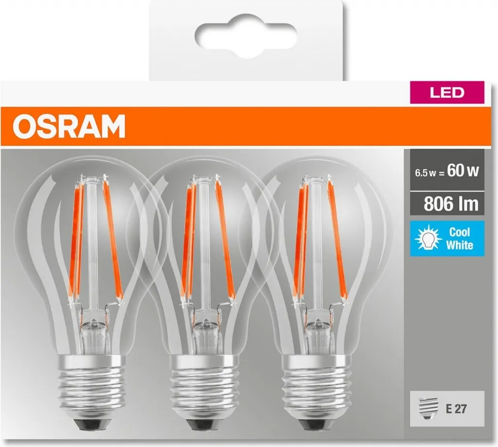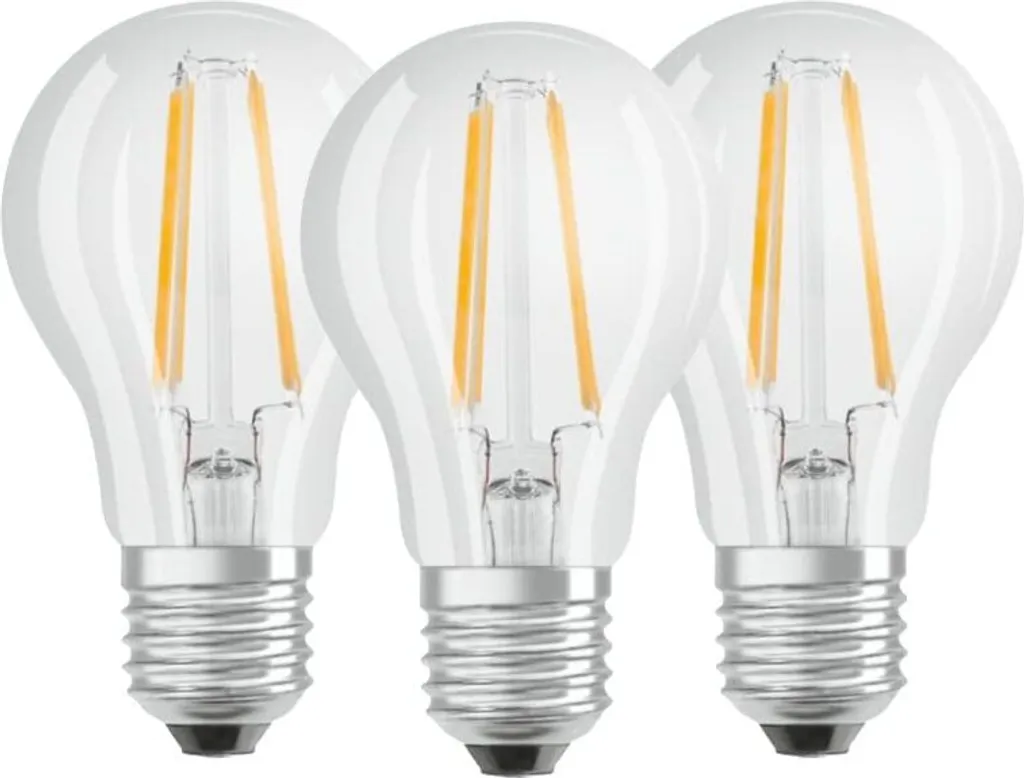 3er-Set klare Standard-LED-Lampen – Sockel: E27 – Leistung: 6,5 W – Äquivalenz: 60 W – Lichtstrom: 806 Lm – Farbtemperatur: 4000 ° K – Lampenfarbe: Warmweiß – Lebensdauer Durchschnitt: 15000 Stunden.