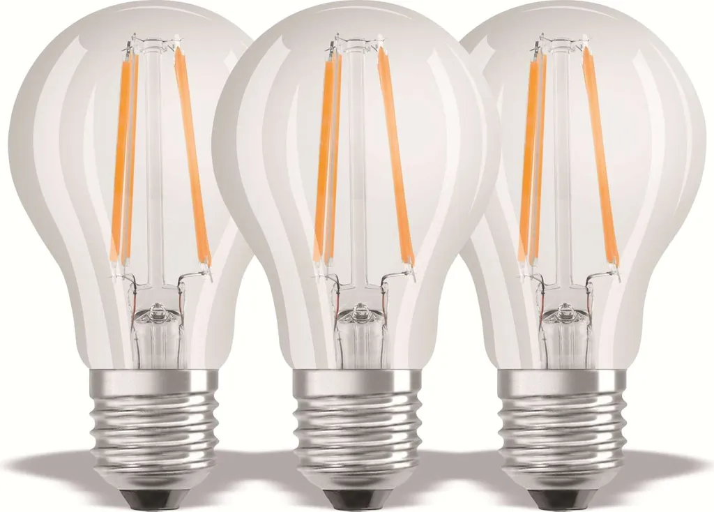 Mit den LED BASE Retrofit Filament Sparpacks der Marke Osram erwerben Sie die qualitativ hochwertige Basis-Version. Die Schaltfestigkeit beträgt 100.000 Schaltzyklen. Sie zeichnen sich besonders durch den, im Vergleich zu normalen LED-Lampen, höheren Wirkungsgrad, breiteren Ausstrahlungswinkel und noch geringeren Stromverbrauch aus. Durch die vertikale Anordnung der Leuchtfäden wird das Licht homogen in alle Richtungen verteilt und die Optik erinnert stark an frühere Glühlampen.