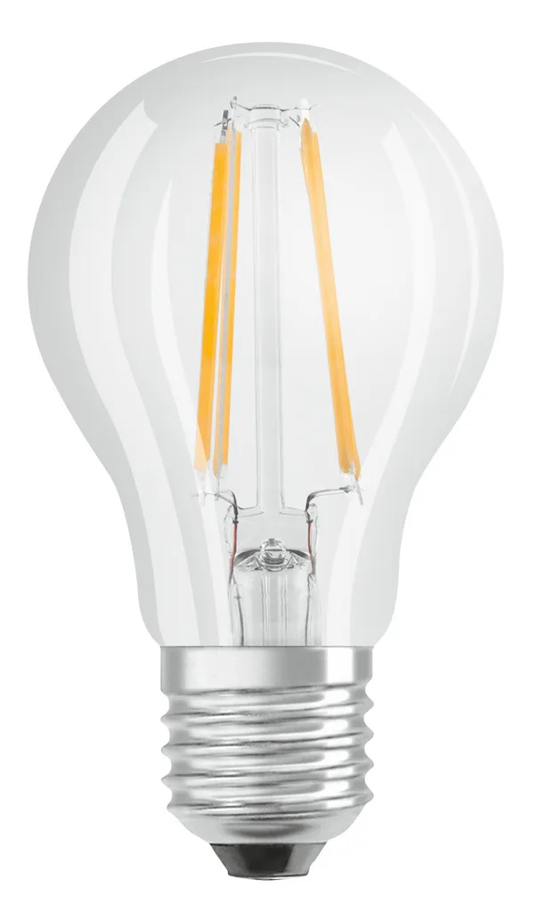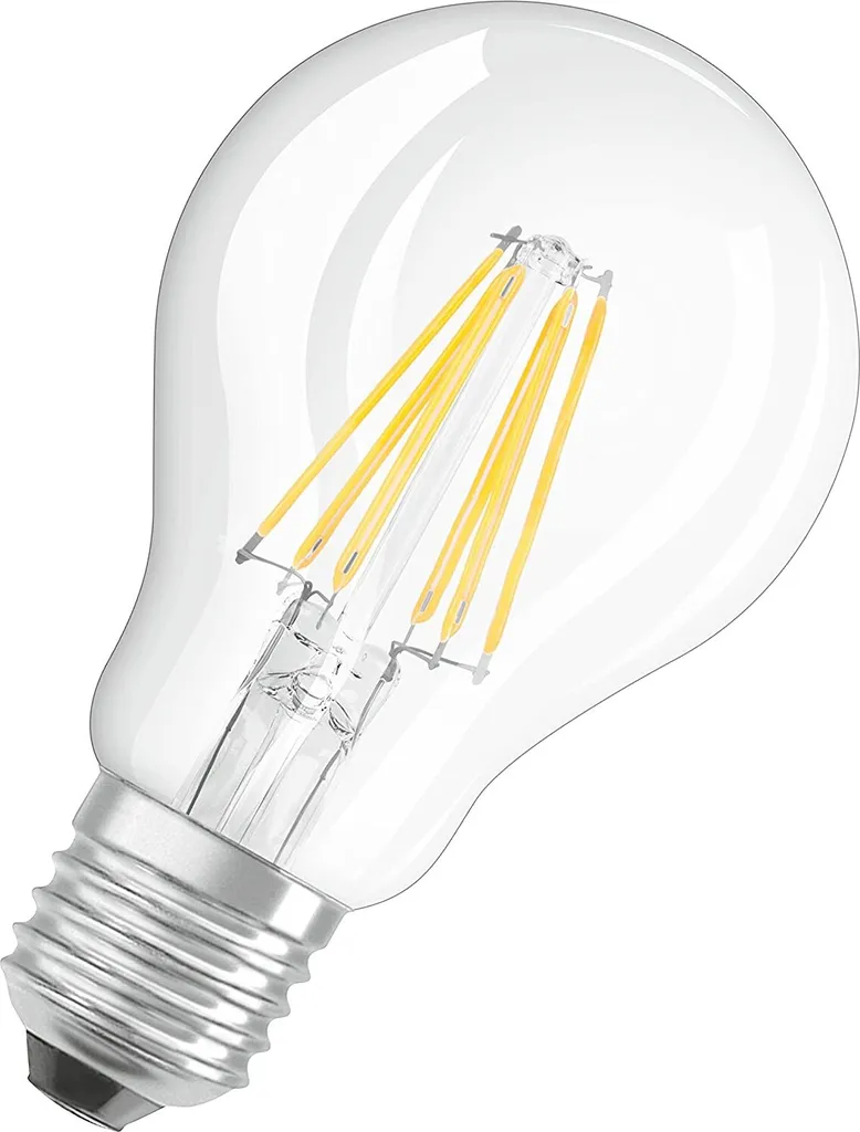 Hochwertige Markenleuchtmittel mit sehr hohem Lichtstrom und enormer Lichtausbeute. Dank innovativer LED-Filament-Technologie überzeugen diese LED durch alle visuellen Eigenschaften einer herkömmlichen Glühbirne.rrTechnische Daten:r- Hochwertige Markenleuchtmittel mit sehr hohem Lichtstrom und enormer Lichtausbeute. Dank innovativer LED-Filament-Technologie überzeugen diese LED durch alle visuellen Eigenschaften einer herkömmlichen Glühbirne. Technische Daten: Energieeffizienzklasse: E EEK-Spektrum: A – G Gewichteter Energieverbrauch: 7 kWh/1000 h Betriebsspannung: 230 V Leistung: 7 W Entspricht Glühlampe: 60 W Bauform: A60 Sockel: E 27 Farbtemperatur: 4000 K (neutralweiß) Lichtstrom: 806 lm Lichtausbeute: 115 lm /W Abstrahlwinkel: 300° Geeignet für Akzentbeleuchtung: nein Dimmbar: nein Farbwiedergabeindex (CRI): > 80 Ra Mittlere Lebensdauer: 10.000 Stunden Schaltzyklen: 100.000 Lichtstromerhalt am Ende der Lebenszeit: 70 % Zündzeit: < 1 s Anlaufzeit bis 60 %: < 1 a Leistungsfaktor: 0,4 Quecksilbergehalt: 0,0 mg Gesamtmaße (ØxH): 60×105