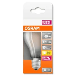 Nennleistung 5,00 W, Nennspannung 220…240 V, Leistungsaufnahme der herkömmlichen Lampe 40 W, Lichtfarbe (Bezeichnung) Warm White – Farbtemperatur 2700 K, Lichtstrom 470 lm, Farbwiedergabeindex Ra =80, Durchmesser 60,0 mm, Außenkolben A60, Länge 105,0 mm, Lebensdauer 15000 h, Anzahl der Schaltzyklen 100000, Sockel (Normbezeichnung) E27