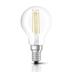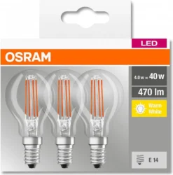 Hochwertiges Markenleuchtmittel mit extrem hohem Lichtstrom und enormer Lichtausbeute. Dank innovativer LED-Filament-Technologie überzeugt diese LED durch alle visuellen Eigenschaften einer herkömmlichen Glühbirne. Technische Daten: – Energieeffizienzklasse: E – EEK-Spektrum: A – G – Gewichteter Energieverbrauch: 4 kWh/1000 h – Betriebsspannung: 230 V – Leistung: 4 W – Entspricht Glühlampe: 40 W – Bauform: Miniball P40 – Sockel: E14 – Farbtemperatur: 2700 K (warmweiß) – Lichtstrom: 470 lm – Lichtausbeute: 117 lm /W – Abstrahlwinkel: 320° – Geeignet für Akzentbeleuchtung: nein – Dimmbar: nein – Farbwiedergabeindex (CRI): > 80 Ra – Mittlere Lebensdauer: 15.000 Stunden – Schaltzyklen: 100.000 – Lichtstromerhalt am Ende der Lebenszeit: 70 % – Zündzeit: < 1 s – Anlaufzeit bis 60 %: < 1 a – Leistungsfaktor: 0,4 – Quecksilbergehalt: 0,0 mg – Gesamtmaße (ØxH): 45×78