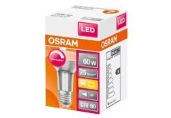 Dimmbare LED-Reflektorlampen R63 mit Retrofit-Schraubsockel. Produkteigenschaften: Professionelle LED-Alternative zu Halogenlampen. Gute Farbwiedergabe: bis zu Ra 90. Dimmbar (an vielen handelsüblichen Dimmern). Quecksilberfreie Lampen. Produktvorteile: Sehr lange Lebensdauer von bis zu 25.000 h. Geringer Energieverbrauch. Einfacher Ersatz von Halogenlampen dank kompaktem Design. Sofort 100 % Licht, keine Aufwärmzeit. Anwendungsgebiete: Vitrinen und Schaufenster. Museen, Galerien. Gastronomie. Wohnräume. Als Downlight zur Markierung von Gängen, Türen, Treppen, etc.. Einsatz im Außenbereich nur in geeigneten Außenleuchten.Leuchtmitteltyp: LED SMDFassung: E27Leistung: 5,9 WLichtleistung: 345 lmLichtfarbe: 2.700 K (warmweiß)Dimmbar: jaBauart: Reflector R63Farbe: klarMaterial: GlasMaße: 10,2 x 6,3 cm (L x Ø)Abstrahlwinkel: 36°Lebensdauer: 25.000 hSchutzart: IP20Entspricht: Glühbirne 60 WTemperaturbereich: -20 bis +40°CSpannung: 220-240V, 50/60 HzLieferumfang: 1x Leuchtmittel