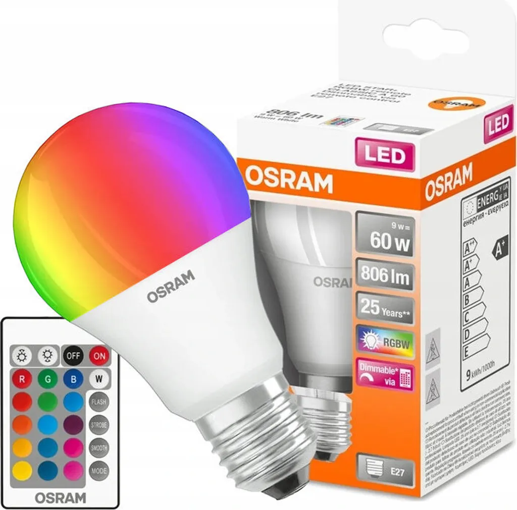 Lieferumfang: 1 x Osram LED Lampe mit Fernbedienung RGBW dimmbar E27 warmweiß 2700K 9W Farbwechsel – Artikel wie abgebildet
