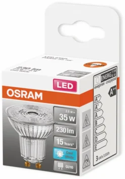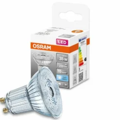 Hochwertige Markenleuchtmittel 100% Quecksilberfrei in bester Qualität der Marke OSRAM. Einfacher Austausch und echter Ersatz. – ST PAR 16 35 36° 2.6 W/4000K GU10 – 1x LED-Reflektorlampe GU10, 2.60 W, 220…240 V, Cool White, 4000 K, 100% Quecksilberfrei – in bester Qualität der Marke OSRAM – Energieverbrauch 3 kWh/1000h bei 230 lm – Lange Lebensdauer – bis zu 15000 Stunden und bis zu 100000 Schaltzyklen – Kaltweißes Licht für erhöhten Anforderungen an die Konzentration und Sehleistung, in Küche, Bad oder Büro – Sofort volles Licht, keine Aufwärmzeit – Einfacher Austausch von Halogenlampen, echter Ersatz für eine konventionelle 35-W-Spot-Lampe (Einsatz im Außenbereich nur in geeigneten Leuchten) – Geringere Wärmeentwicklung (gegenüber dem Standardreferenzprodukt) Features: – Geringer Energieverbrauch – Einfacher Ersatz von Halogenlampen durch kompaktes Design in Vollglas und einzelner Linse – Sofort 100 % Licht, keine Aufwärmzeit – Ideal für die wirtschaftliche Spotbeleuchtung Technische Daten: – Energieeffizienzklasse: F – EEK-Spektrum: A – G – Gewichteter Energieverbrauch: 3 kWh/1000h – Betriebsspannung: 220…240 V – Nennleistung: 2,60 W – Leistungsaufnahme der herkömml. Lampe: 35 W – Lichtfarbe: Neutralweiß – Bauform: PAR51 Klar – Sockel: GU10 – Farbtemperatur: 4000 K – Lichtstrom: 230 lm – Lichtausbeute: 88 lm/W – Farbwiedergabeindex Ra: ≥80 – Abstrahlwinkel: 36 ° – Dimmbar: Nein – Nennlebensdauer: 15000 h – Anzahl der Schaltzyklen: 100000 – Zündzeit: < 0,5 s – Anlaufzeit bis 60 %: < 0,50 s – Leistungsfaktor: > 0.50 – Quecksilbergehalt: 0,0 mg – Produktgewicht: 43,00 g – Durchmesser: 51,0 mm – Länge: 55,0 mm