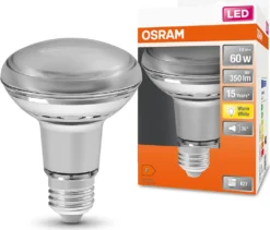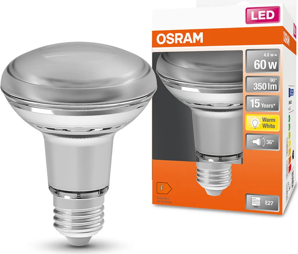 R 80 LED Reflektorlampen, SchraubfuĆ. Produkteigenschaften: Professionelle LED-Alternative zu Halogenlampen. Quecksilberfreie Lampen. Produktvorteile: Lebensdauer von bis zu 15.000 Stunden. Geringer Energieverbrauch. Einfacher Austausch von Halogenlampen dank des kompakten Designs. Sofortige Zündung. Anwendungsbereiche: Plakatwand und Schaufenster. Museen, Kunstgalerien. Zuhause. WohnrƤume. Als Scheinwerfer zum Markieren von Wegen, Türen, Treppen usw. Verwendung im Freien, nur in geeigneten Leuchten.