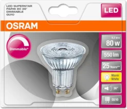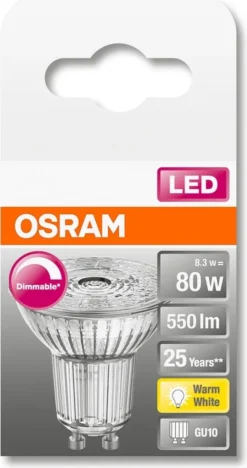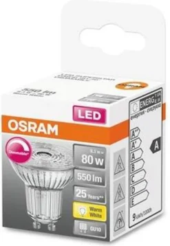 Hochwertige Markenleuchtmittel 100% Quecksilberfrei in bester QualitƤt der Marke OSRAM. Einfacher Austausch und echter Ersatz. – SST PAR 16 80 36° 8.3 W/2700K GU10 – 1 x LED-Reflektorlampe GU10, 8.30 W, 220ā¦240 V, Warm White, 2700 K, Dimmbar, 100% Quecksilberfrei ā in bester QualitƤt der Marke OSRAM – Energieverbrauch 9 kWh/1000h bei 550 lm – Stufenlos dimmbar – schaffen Sie Ihre persƶnliche LichtatmosphƤre (an vielen handelsüblichen Dimmern, siehe auch ledvance.de/dim) – Sehr lange Lebensdauer ā bis zu 25000 Stunden und bis zu 100000 Schaltzyklen – WarmweiĆes Licht für Wohlbehagen und Entspannung in Wohn-, Schlaf-, und Kinderzimmern – Sofort volles Licht, keine AufwƤrmzeit – Einfacher Austausch von Halogenlampen, echter Ersatz für eine konventionelle 80-W-Spot-Lampe (Einsatz im AuĆenbereich nur in geeigneten Leuchten) Features: – Geringer Energieverbrauch – Hohe Farbkonsistenz dank engem Binning – Einfacher Ersatz von Halogenlampen durch kompaktes Design in Vollglas und einzelner Linse – Ideal für die wirtschaftliche Spotbeleuchtung Technische Daten: – Energieeffizienzklasse: G – EEK-Spektrum: A ā G – Gewichteter Energieverbrauch: 9 kWh/1000h – Betriebsspannung: 220ā¦240 V – Nennleistung: 8,3 W – Leistungsaufnahme der herkƶmml. Lampe: 80 W – Lichtfarbe: WarmweiĆ – Bauform: PAR51 – Sockel: GU10 – Farbtemperatur: 2700 K – Lichtstrom: 550 lm – Lichtausbeute: 66 lm/W – Farbwiedergabeindex Ra: ā„90 – Abstrahlwinkel: 36 ° – Dimmbar: Ja – Nennlebensdauer: 25000 h – Anzahl der Schaltzyklen: 100000 – Zündzeit: < 0,5 s – Anlaufzeit bis 60 %: < 0,50 s – Leistungsfaktor: 0.70 – Quecksilbergehalt: 0,0 mg – Produktgewicht: 56,00 g – Durchmesser: 50,0 mm – LƤnge: 52,0 mm