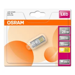 Hochwertige Markenleuchtmittel 100% Quecksilberfrei in bester Qualität der Marke OSRAM. Einfacher Austausch und echter Ersatz. – PIN 30 320° 2.6 W/2700K GY6.35 – 1x LED-Lampe GY6.35, 2.60 W, 12 V, Warm White, 2700 K, 100% Quecksilberfrei – in bester Qualität der Marke OSRAM – Energieverbrauch 3 kWh/1000h bei 300 lm – Lange Lebensdauer – bis zu 15000 Stunden und bis zu 100000 Schaltzyklen – Warmweißes Licht für Wohlbehagen und Entspannung in Wohn-, Schlaf-, und Kinderzimmern – Sofort volles Licht, keine Aufwärmzeit – Einfacher Austausch von Standardglühlampen, echter Ersatz für eine 30-W-Glühbirne (Außenanwendungen nur in geeigneten Leuchten) – Geringere Wärmeentwicklung (gegenüber dem Standardreferenzprodukt) Features: – Variabler Einsatz an Gleich- und Wechselspannung möglich – Gute Rundum-Lichtausstrahlung – Ideal für den dekorativen und frei brennenden Einsatz – Lange Lebensdauer von bis zu 15.000 h Technische Daten: – Energieeffizienzklasse: F – EEK-Spektrum: A – G – Gewichteter Energieverbrauch: 3 kWh/1000h – Betriebsspannung: 12 V – Nennleistung: 2,6 W – Leistungsaufnahme der herkömml. Lampe: 30 W – Lichtfarbe: Warmweiß – Bauform: T14 Klar – Sockel: GY6.35 – Farbtemperatur: 2700 K – Lichtstrom: 300 lm – Lichtausbeute: 115 lm/W – Farbwiedergabeindex Ra: 80 – Abstrahlwinkel: 320,00 ° – Dimmbar: Nein – Nennlebensdauer: 15000 h – Anzahl der Schaltzyklen: 100000 – Zündzeit: < 0,5 s – Anlaufzeit bis 60 %: < 0,50 s – Leistungsfaktor: > 0.50 – Quecksilbergehalt: 0,0 mg – Produktgewicht: 4,40 g – Durchmesser: 14,0 mm – Länge: 40,0 mm